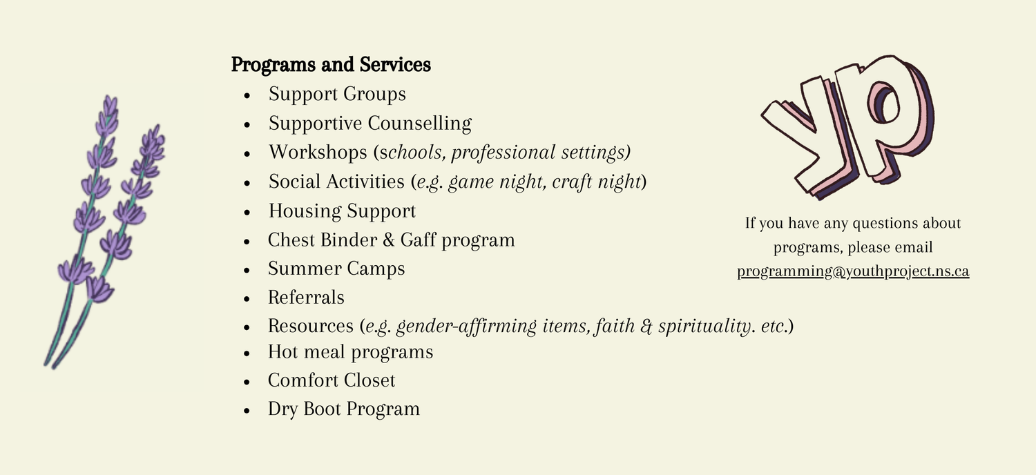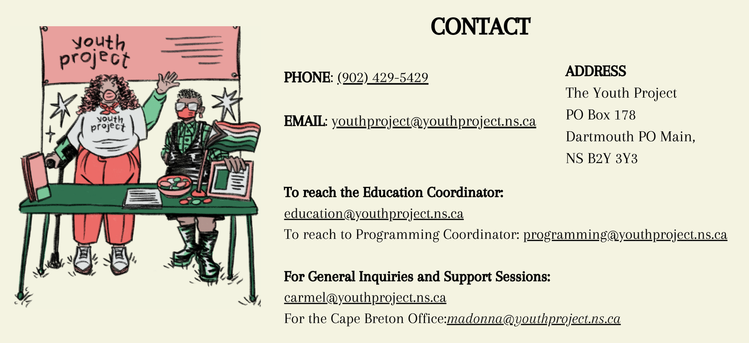 The Youth Project is a non-profit charitable organization dedicated to providing support and services to youth, 25 and under, around issues of sexual orientation and gender identity. We have a provincial mandate and host staff/volunteers in the HRM, Cape Breton, the Valley and travel around the province to meet with youth in other communities. We provide a variety of programs and services including support groups, referrals, peer support, a resource library, educational workshops, social activities.